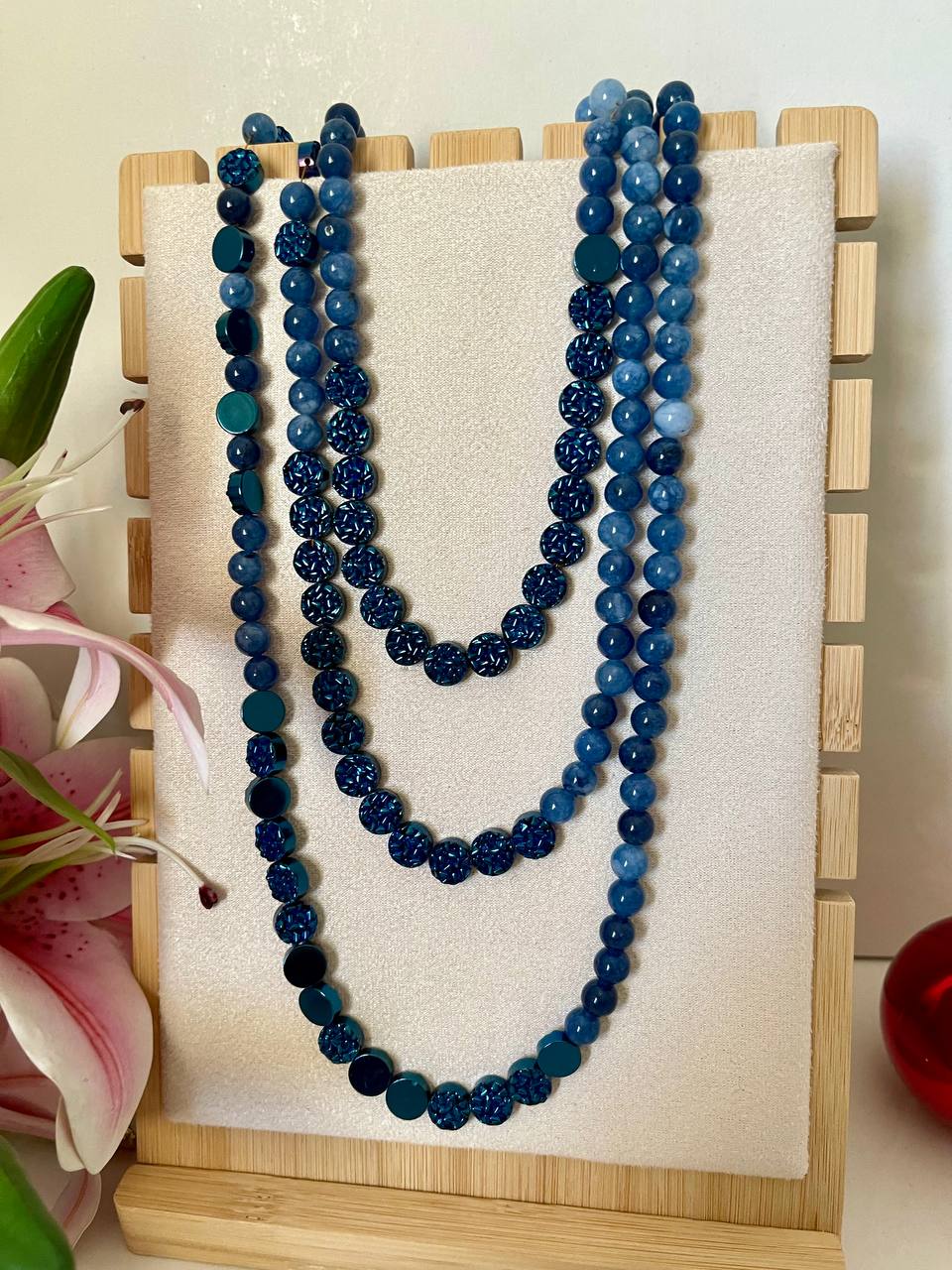 Crafted from genuine blue agate, this layered necklace mixes matte-smooth and sparkling textured beads, offering a refined yet vibrant statement look.